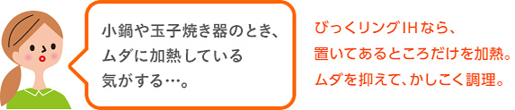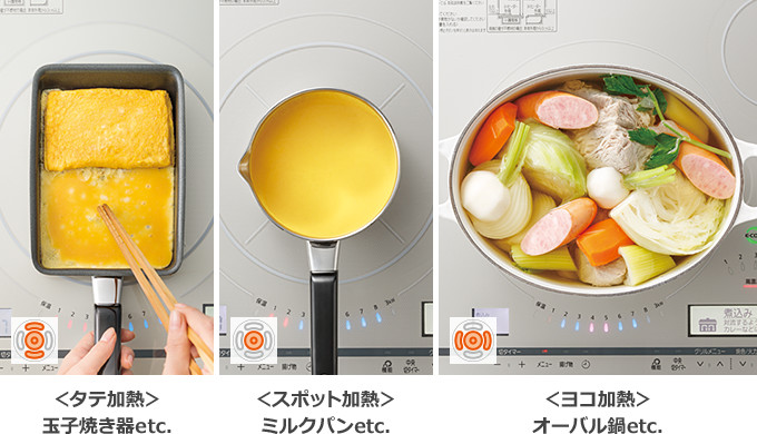 〈びっくリングコイルP〉は、鍋のサイズに合わせて、分割エリアごとに加熱します。たとえば、玉子焼き器などはタテ方向の加熱、ミルクパンなどは中央のスポット加熱、オーバル鍋などはヨコ方向の加熱と、鍋のサイズや形状に合わせた部分加熱がカンタンに。ムダを抑えて、かしこい省エネ調理にぴったりな機能です。