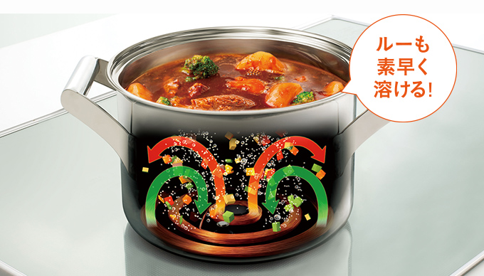 鍋底の内側・外側を交互に加熱することで、鍋の中に対流を起こして自然なかき混ぜ効果を発揮。