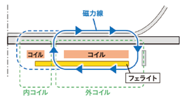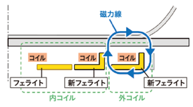フェライトで外側コイルを囲うことで、外側コイルで発生した磁力線を集約。