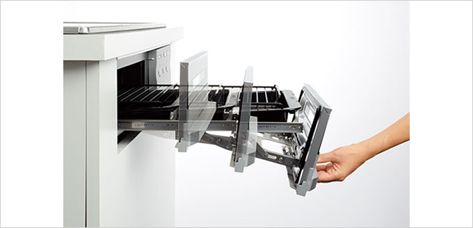 ボリュームのあるメニューも軽快に引き出せるレール式。引き出したときにドアが下がり、ドアの上部に腕が触れにくい工夫もプラスしました。