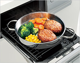 グリルディッシュバリエは、2枚1セット。2枚を組み合わせれば炊飯に、1枚をグリル皿にすればピザやグラタン、お菓子づくりなど多彩な焼き物に使えます。ハンバーグなどのグリル料理は、付け合わせの野菜もいっぺんに調理でき、料理の手際がスピードアップします。