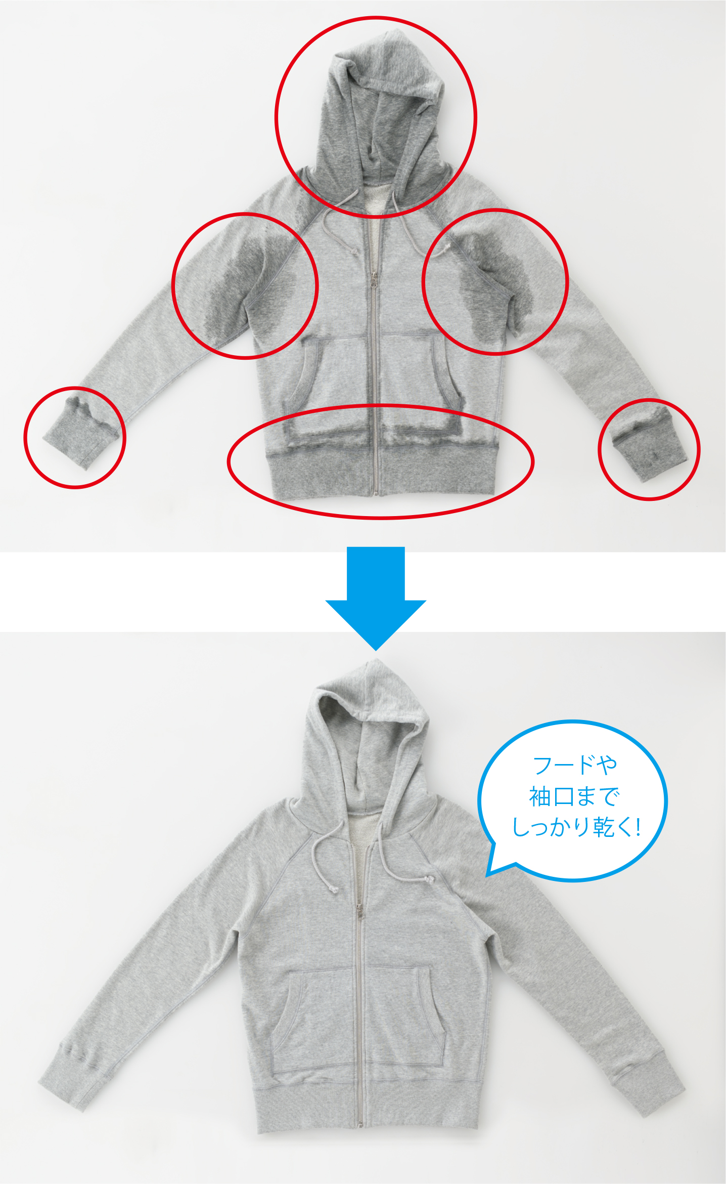イヤなニオイの原因、乾き残りへ、くまなく徹底的に。