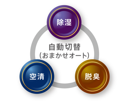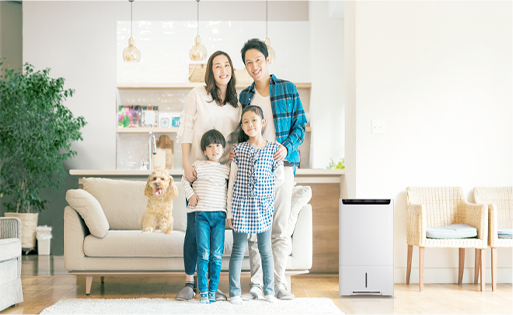 1台で除湿・空気清浄・脱臭の3機能を備えているので場所を取らず、さらに季節ごとの出し入れも要らない。花粉やジメジメや結露、空気の汚れやニオイなど、これ1台で24時間365日「空間ケア」できるから、家族のしあわせな時間をサポートします。