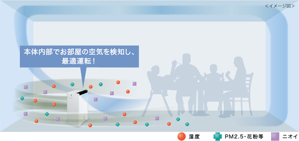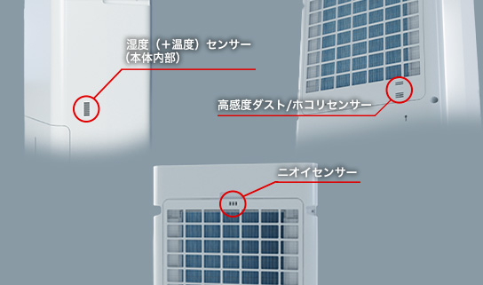 多彩なセンサーでお部屋の空気の状態をモニタリング。湿度(+温度)センサーがお部屋の湿度と温度を、ニオイセンサーが様々な生活臭を、高感度ダスト/ホコリセンサーがPM2.5、PM1.0、花粉などの汚れを自動でセンシング。