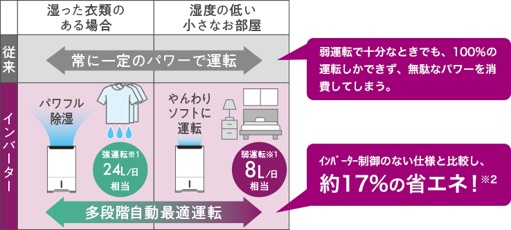 従来制御は、常に100%の能力で運転。それに対し、インバーター制御は、湿度に応じてパワーを自動でコントロール。ムダのない省エネ除湿で電気代もグンとお得に。