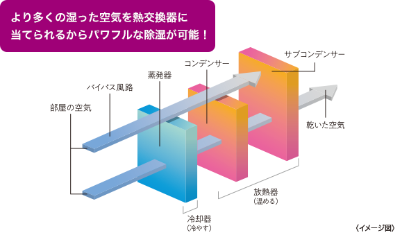 ●冷却器の温度が上がると除湿能力が低下するため、バイパス風路から奥にある放熱器(サブコンデンサー)に部屋の空気を直接当てることで冷却器を冷やすコンプレッサーの負荷を減らし、消費電力を抑制。