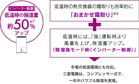 冬場の低温環境にも対応。三菱電機は、コンプレッサー式で、1年中パワフル除湿を実現