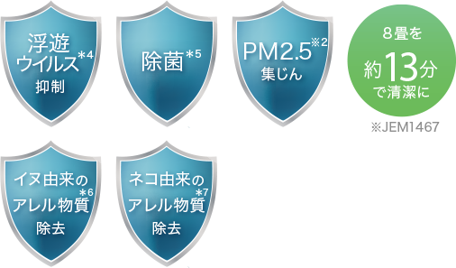 ※2<試験方法>日本電機工業会規格(JEM1467) <判定基準>0.1~2.5μmの微小粒子状物質を32m³(約8畳)の密閉空間で99%除去する時間が90分以内であること。[32m³(約8畳)の試験空間に換算した値です。]