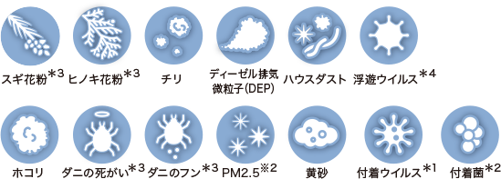 *3<試験機関>東京環境アレルギー研究所 <試験方法>ELISA 法 <試験対象>フィルターに付着した2 種類のアレルゲン(ダニアレルゲン、スギアレルゲン) <試験結果>99%抑制。