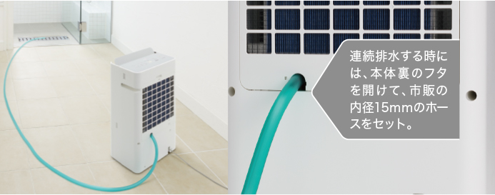 市販のホースを活用すれば、タンクの水捨て要らずで、連続排水が可能なので長時間の使用も大丈夫。