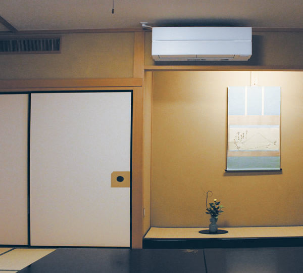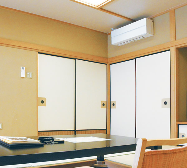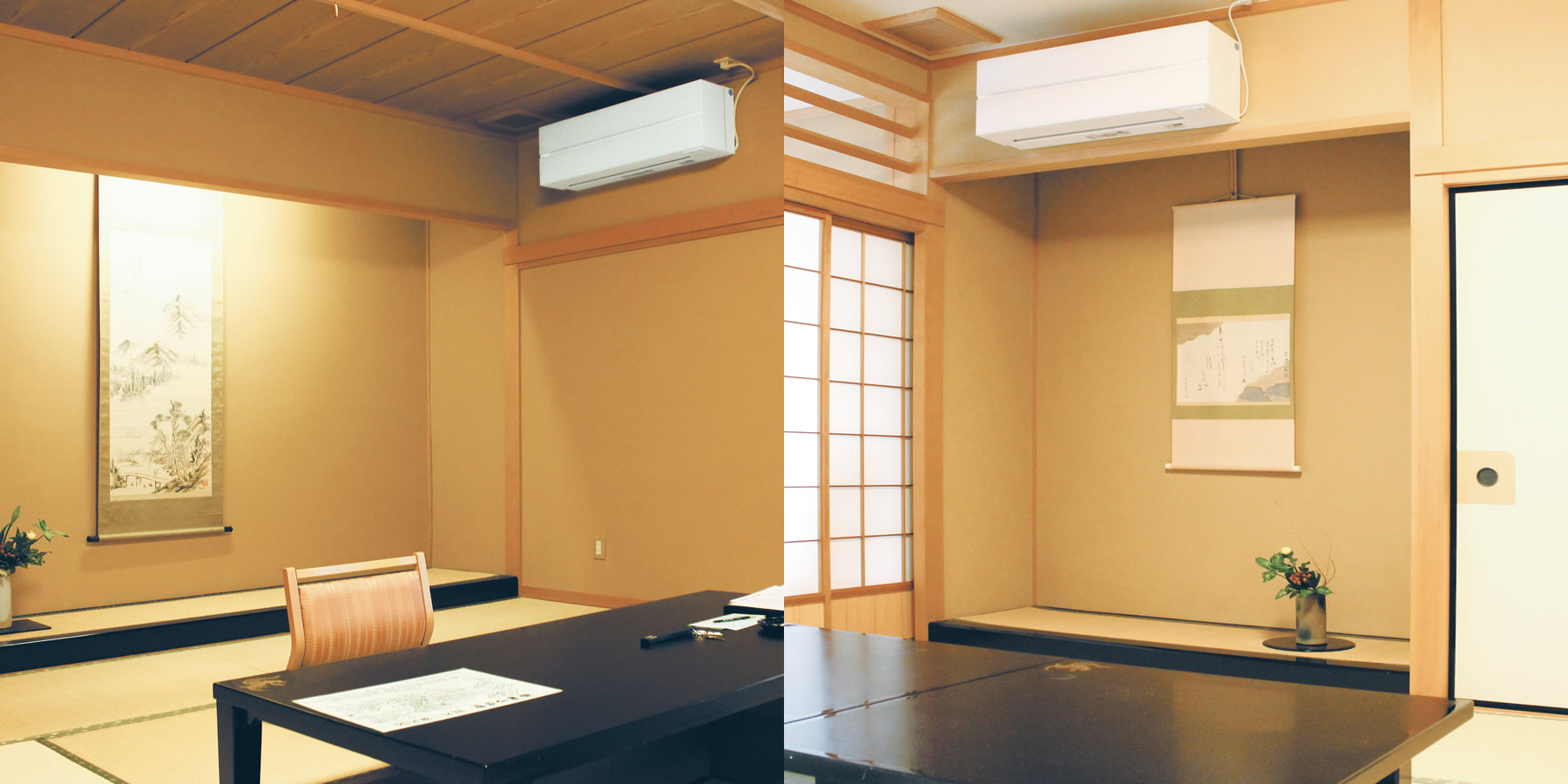 新館「鳳凰」のお部屋には、霧ヶ峰Style FLシリーズを設置。数寄屋造りの凛とした、たたずまいのお部屋でお客さまにご快適におくつろぎいただくための空調としてご使用いただいております。