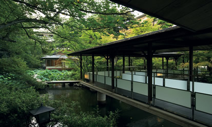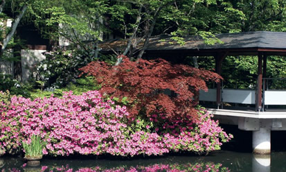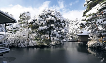 旅館にある広大な日本庭園。春には桜、夏にはハスの花、秋には紅葉、冬には雪化粧と四季折々の美しさで、お客さまをお迎えしています。