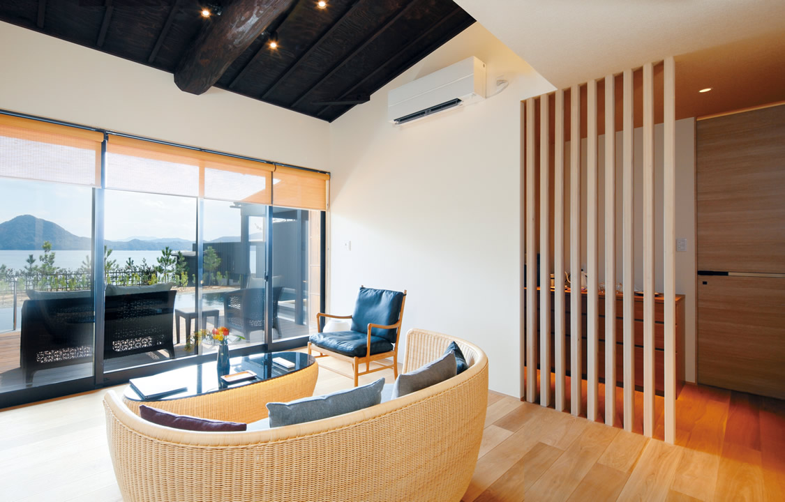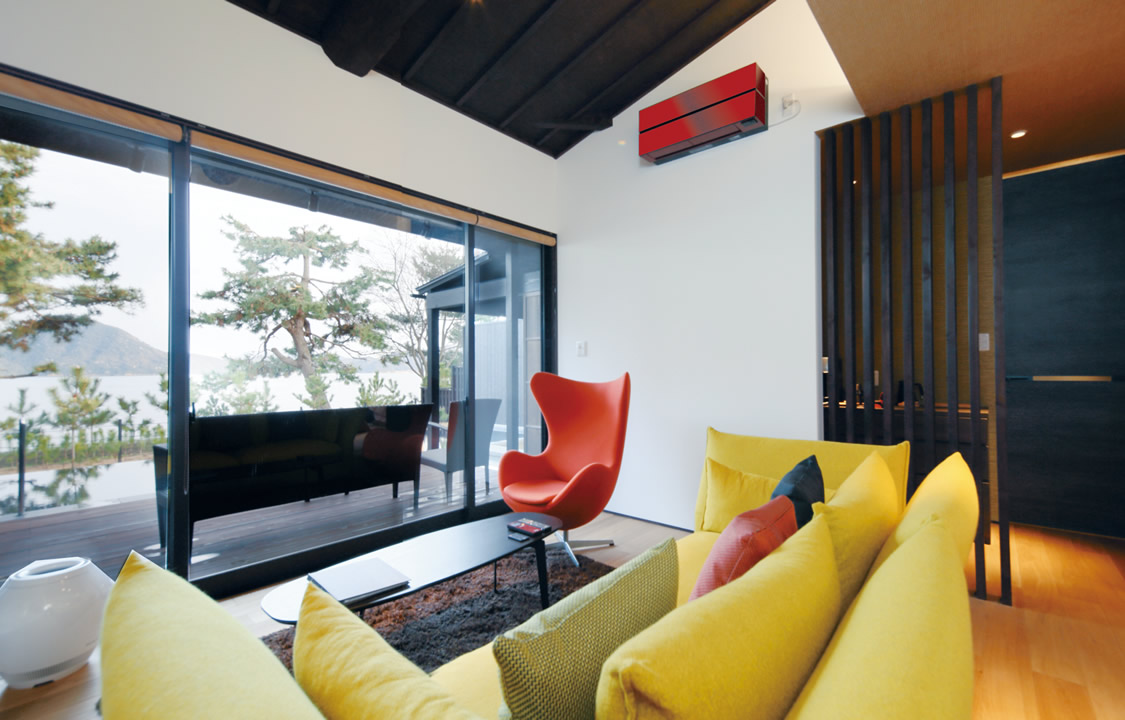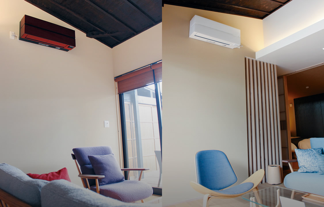 初めて見たときの赤色のインパクトは大きく、素直に驚きました。「エアコンでもデザインにこだわれるのだ」という発見がありました。この宿を手掛けるにあたって、お部屋の調度品の選定にはかなり時間を掛けましたが、エアコンは、FLシリーズを見て「ベストマッチ」だと思い、すぐに決定しました。フラップやセンサーが隠れる設計、単一的ではないカラーリングなど、見せるインテリアとして、プロダクトへの強いこだわりを感じました。