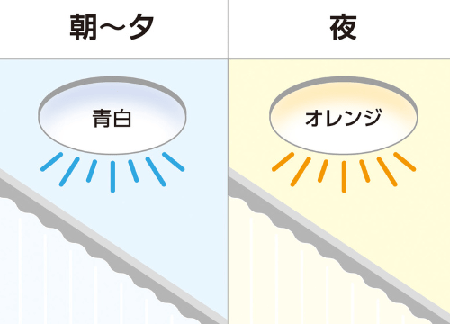 太陽のリズムに合わせて、朝から夕方までは、青白い照明にすることでやる気や集中力を高め、夕方以降はオレンジ色に近い照明にすることで睡眠の質が向上し、効率よく記憶を定着させることができます。