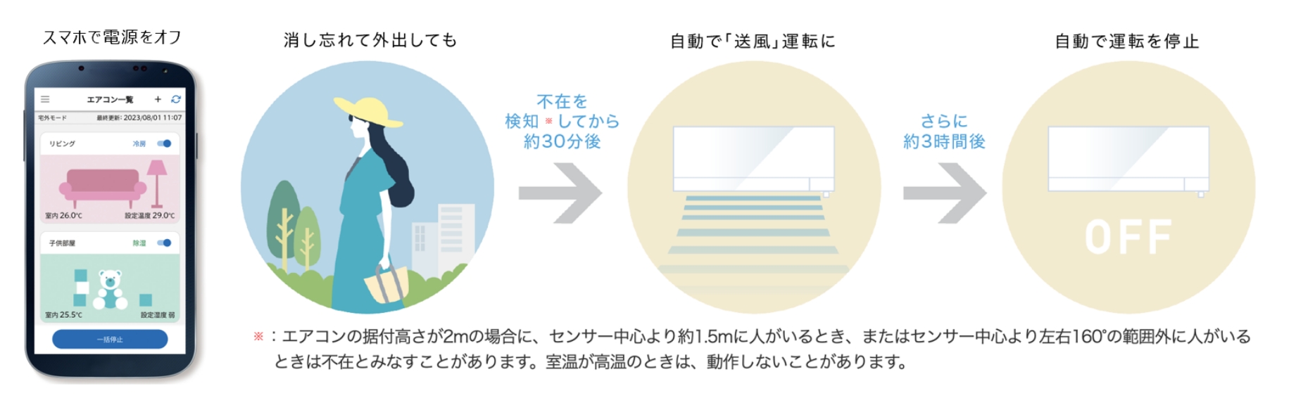 霧ヶ峰には、うっかり消し忘れても外からスマホで電源をオフできる機能や人の不在を検知して自動で電源をオフできる機能を搭載しています。