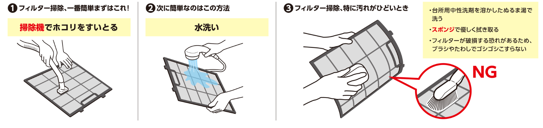 ・汚れたフィルターでは吸い込む風量が減り、お部屋の空気を循環させるのに時間がかかってしまい冷房効率が下がってしまうことも…。フィルターを約半年間(1日8時間の使用を想定)お手入れしなかった場合、新品のフィルターを使用している場合と比較して、消費電力が約12%も悪化するという実験結果もあります。