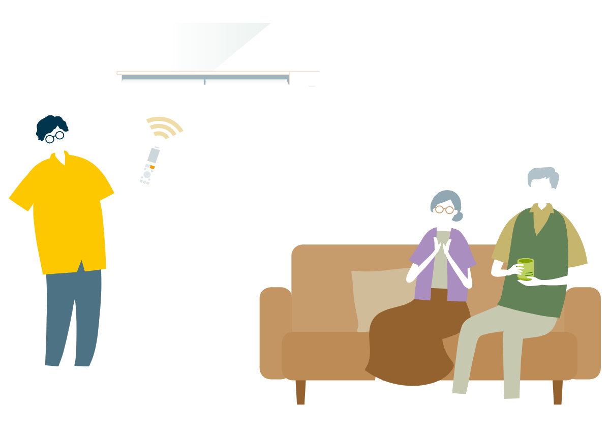 離れていてもご両親の部屋の室温をみまもることができ、リモコン操作が苦手なご両親に代わって遠隔で設定温度などを調節することができます。