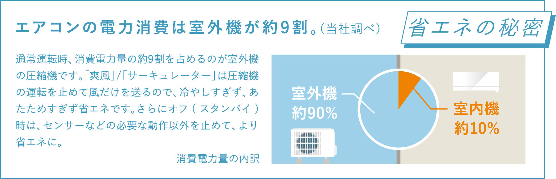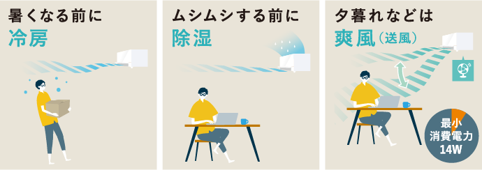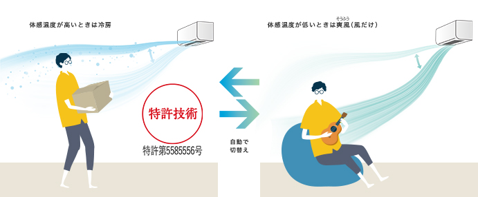 夏は体感温度にあわせて「冷房」と「爽風(送風)」の2つの運転をエアコンが自動で切り替えます。