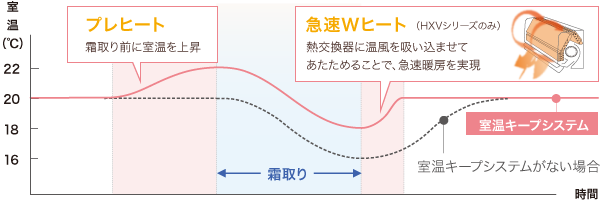 エアコンは、室外機に付着した霜を溶かすために、暖房運転を停止し霜取りをする必要があります。霧ヶ峰ではあらかじめ室温を上げることで、霜取り中の室温低下を抑制する室温キープシステムを採用しています。