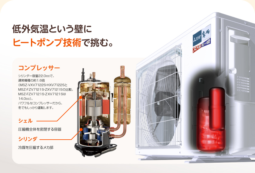エアコンは外気の熱を集めて、暖房エネルギーとして利用し、室内の温度を上げる。だから、少ない電力消費で室内を暖められ省エネにもつながっている。しかし、外気温が低いほど条件は厳しくなる。-15℃もの低外気温になると冷媒回路内の圧力が下がり、冷媒の密度が低下、循環量が減る。熱を運ぶ冷媒が減れば、暖める能力も落ちてしまうのだ。低外気温でも冷媒循環量を上げるためのアイディアが必要になった。