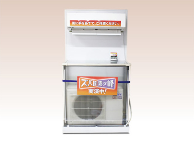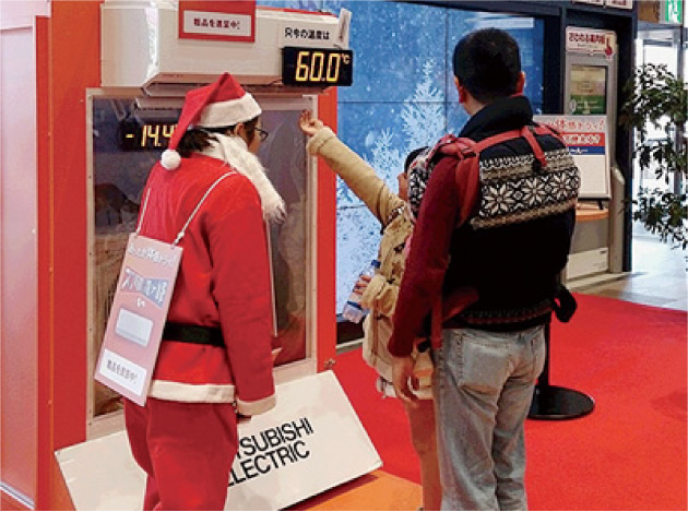 ※1. 室外機をアクリルケースに閉じ込め、その中で-12℃~18℃の低温環境を再現。その条件下で、エアコンから出る60℃の温風を体感してもらった。