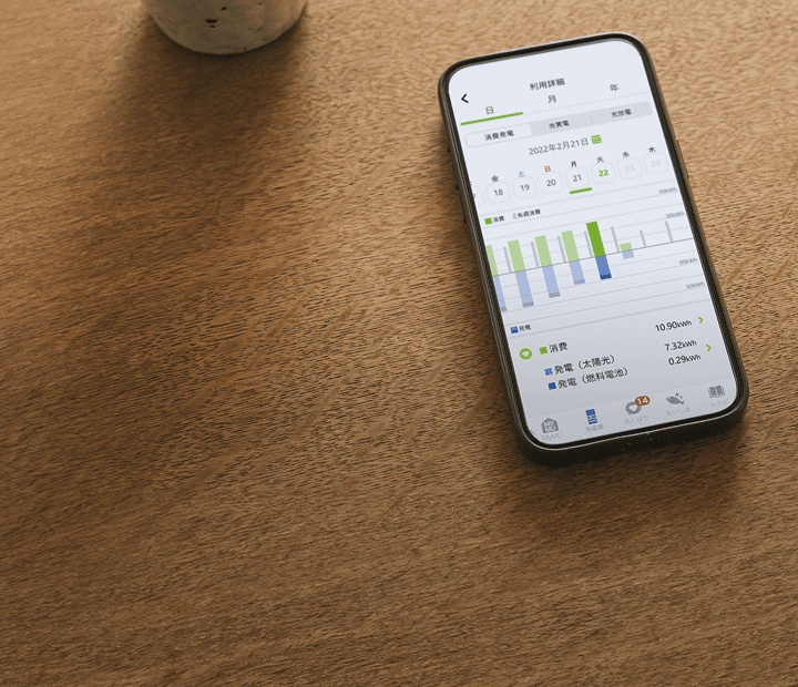 現在の宅内の消費電力、太陽光発電の発電電力などをリアルタイムで確認することができます。