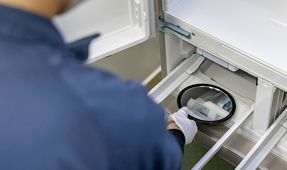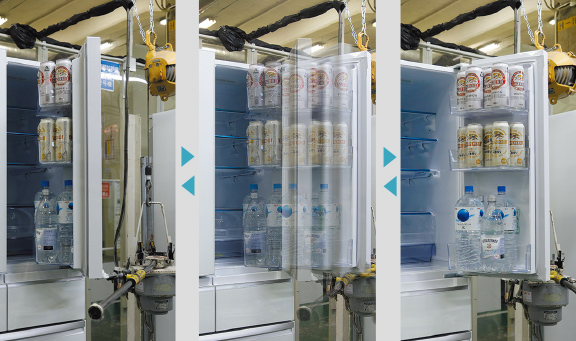 冷蔵室は最も頻繁に開け閉めする場所だから、故障しにくい設計が欠かせません。ドアポケットに飲料を入れた状態で開閉を数十万回繰り返し、ドアヒンジが変形しないこと、ドア脱落などの危険がないことを確認しています。