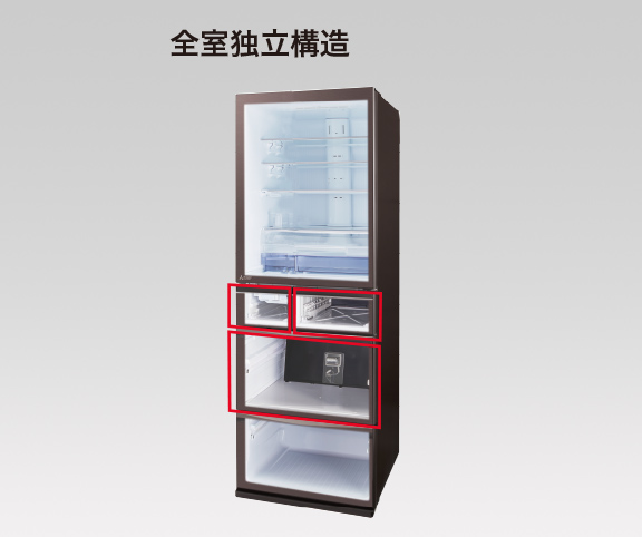 「電気代がかかる」「においが移りやすい」――こうしたお客様の声にお応えして全室独立構造を採用。すべての部屋を仕切り、全室に温度センサーと扉開閉センサーを搭載してきめ細かく管理することにより、消費電力を抑え、他の部屋へのにおい移りや閉め忘れも防ぎます。