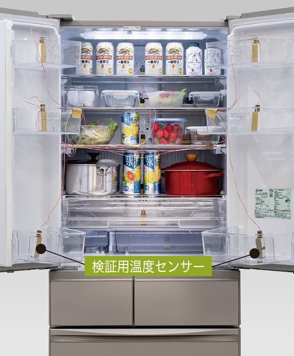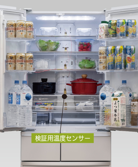 冷蔵室を満杯にして、食品が詰まった状態でも庫内の食品が温度を保てているかを検証します。