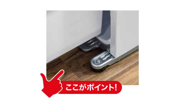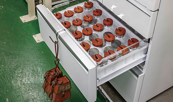 小さな子どもが、冷蔵室に入れた飲料などを取ろうとして、冷凍室や野菜室を引き出して踏み台のように乗る可能性があります。そのような場合でも冷蔵庫が倒れてこないことを、重りをつけて検証しています。