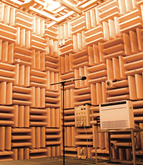 静岡製作所内の無響音室に製品を置いて通電し、冷蔵庫が発する小さな異常音を逃さないよう検証しています。