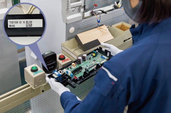 多品種をミックス生産する冷蔵庫の製造ラインにデジタルトランスフォーメーション(DX)を導入。電子基板などの重要部品は二次元コードで管理するとともに、製造ライン上での自動確認を行うことで、ムダを排除して生産性を高めています。