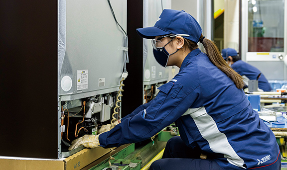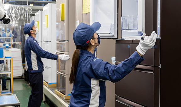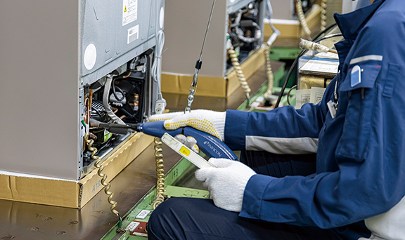 最終検査では、全数通電して運転状態を確認。さらには運転音、ガス漏れ、キズや汚れ、扉の開け閉めのしやすさなどを、人の感覚も使ってチェックしています。第三者認証である「S-JET*」認証も取得しています。