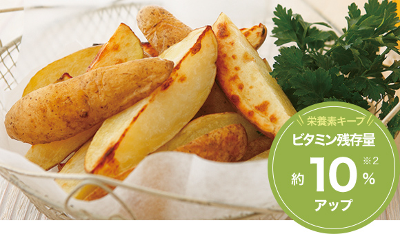 ※2じゃがいも100gあたりのビタミンC残存量は「オーブン」で13.4mg、「レンジ▶グリル」加熱で14.8mg(当社調べ)。