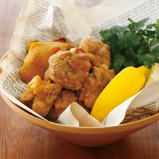 - ビニール袋に切ったとり肉とから揚げ粉を入れ、よくふってまんべんなく粉をつける。