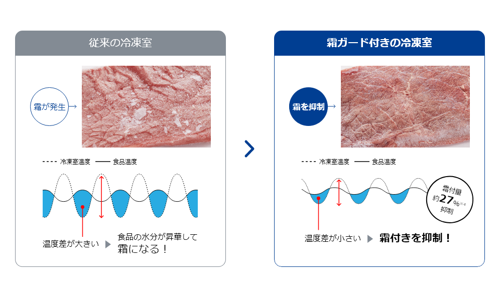 | ※4 | 外気温25℃、牛肉を冷凍室で4週間保存したときの霜付量を比較。牛肉100gあたりの霜付量「霜ガード」OFF(1.5g)、「霜ガード」ON(1.1g)。当社独自の測定結果で、食品の種類や使用状況により効果は異なります。 |