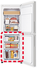 温度上昇の影響を受けにくいため、上段エリアの普段使いの食品も、下段エリアのまとめ買い食材も安心して保存できます。