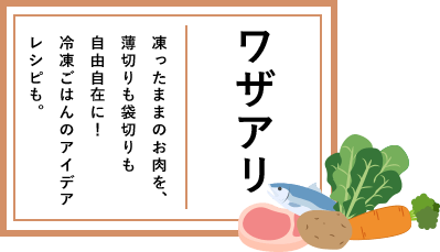三菱冷蔵庫 凍った食材を解凍せずにそのまま使えて忙しい朝のお弁当づくりにも大活躍!切れちゃう瞬冷凍を活用した簡単レシピをシーンごとにご紹介します。 蒸し鶏のトマトソース タンドリーチキンペンネのサラダ 豚薄切りのピカタほうれん草のみそあえ 肉巻き冷凍ポテトきのこの明太子炒め 切れちゃうきんぴらの混ぜずし 豚ひき肉照り焼き弁当 プチカレーキッシュ きんぴらごぼう きんぴらハンバーグ カレーポテト カレーポテトのミニオムレツ 肉じゃが 和風グラタン ジャーマンポテト風 カムジャタン風スープ 鶏肉と野菜の甘辛煮 甘辛煮のミルクグラタン 鶏肉と野菜の甘酢あんかけ 鶏のごまピカタ ヘルシーとんかつ チキンのイタリアンサンド スパム&きんぴらご飯サンド 鶏と豆のドライカレー カルボナーラ風焼きリゾット ポークチップス まぐろカルパッチョ ガーリックチキンプレート スパイシーシーフード ポモドーロソース 豆腐ニョッキ トマトリゾット バーニャカウダソース バーニャカウダポテト バーニャカウダトースト ポテト料理の素 スパニッシュオムレツ シェパーズパイ フルーティティラミス イチゴとキウイの生ジャム あずきアイス フローズンヨーグルト フルーツのせフローズンヨーグルト 三菱冷蔵庫製品トップへ