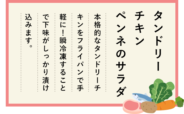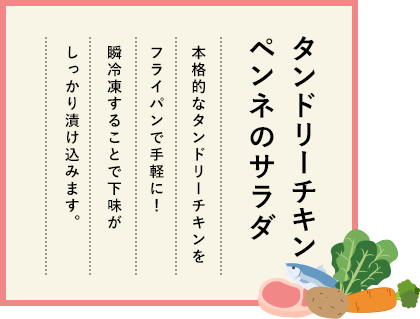 - 2.ペンネにオリーブオイル大さじ1をからめ、保存容器に入れて「切れちゃう瞬冷凍A.I.」で凍らせる。