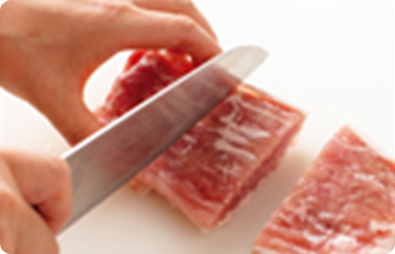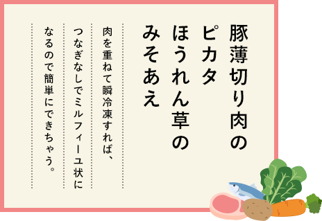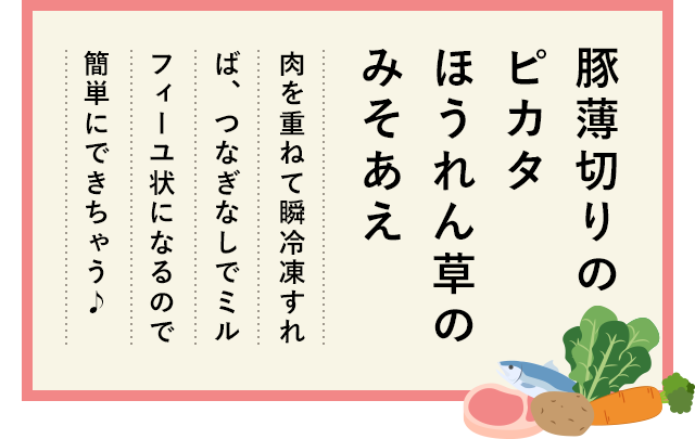 - 1.豚肉300gは厚さ5㎜くらいにつぶして形を整えラップに包み、「切れちゃう瞬冷凍A.I.」で凍らせておく。