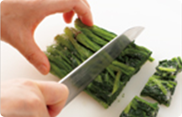 ゆでたほうれん草を「切れちゃう瞬冷凍A.I.」し、端から刻んでみそ、マヨネーズとからめる。自然解凍している間に味がなじみます。