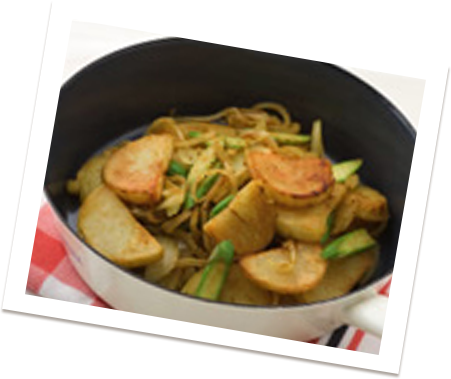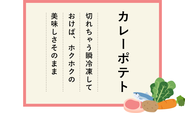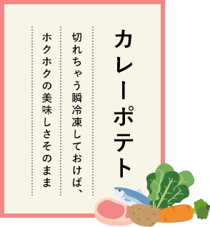 カレーポテトをいっぱいつくって熱いまま「切れちゃう瞬冷凍A.I.」しておけば、ホクホクのおいしさそのままに、いろんなレシピに拡がる、つながる!