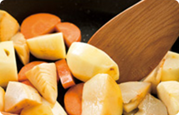 じゃがいも、たけのこなどの野菜は、炒めた鶏肉をとり出してからしっかり炒めてコクを出す。