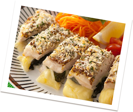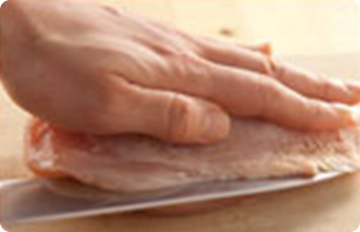 - 1.鶏肉は凍ったまま開くようにして横半分に切れ目を入れる。チーズは5mm厚さに切る。