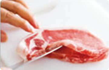 - 1.「切れちゃう瞬冷凍A.I.」した豚ロース肉は厚さ5mmのところで袋状に切り込みを入れ、塩、こしょうしておく。