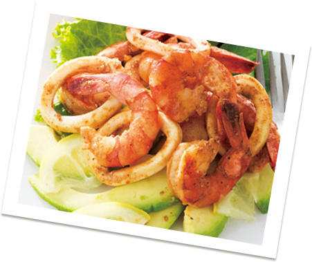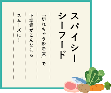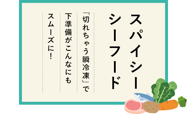 - 1.海老とイカは下処理をし、「切れちゃう瞬冷凍A.I.」をしておく。