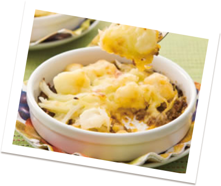- 2.耐熱容器を2 つ用意し、それぞれに1.をしき、その上に「切れちゃう瞬冷凍A.I.」したポテトの素を平に重ねてのせる。さらにとろけるチーズを上にふる。