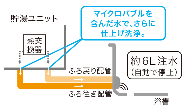 循環洗浄終了後には、注水による水流&マイクロバブルでさらに徹底洗浄※9。配管等に残った汚れも洗い落とします。