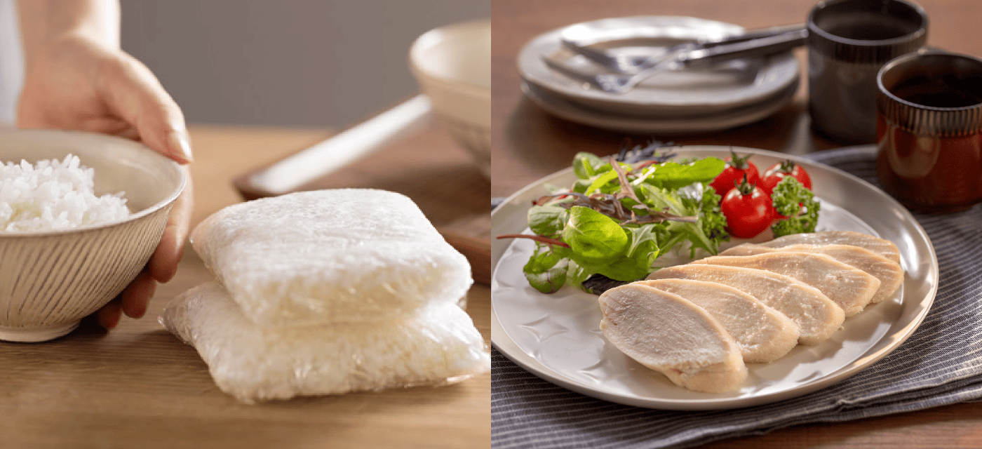 低温調理でおかずが作れる温めた「冷凍ごはん」と「低温調理のおかず」があれば、献立がらくらく&ヘルシーに。