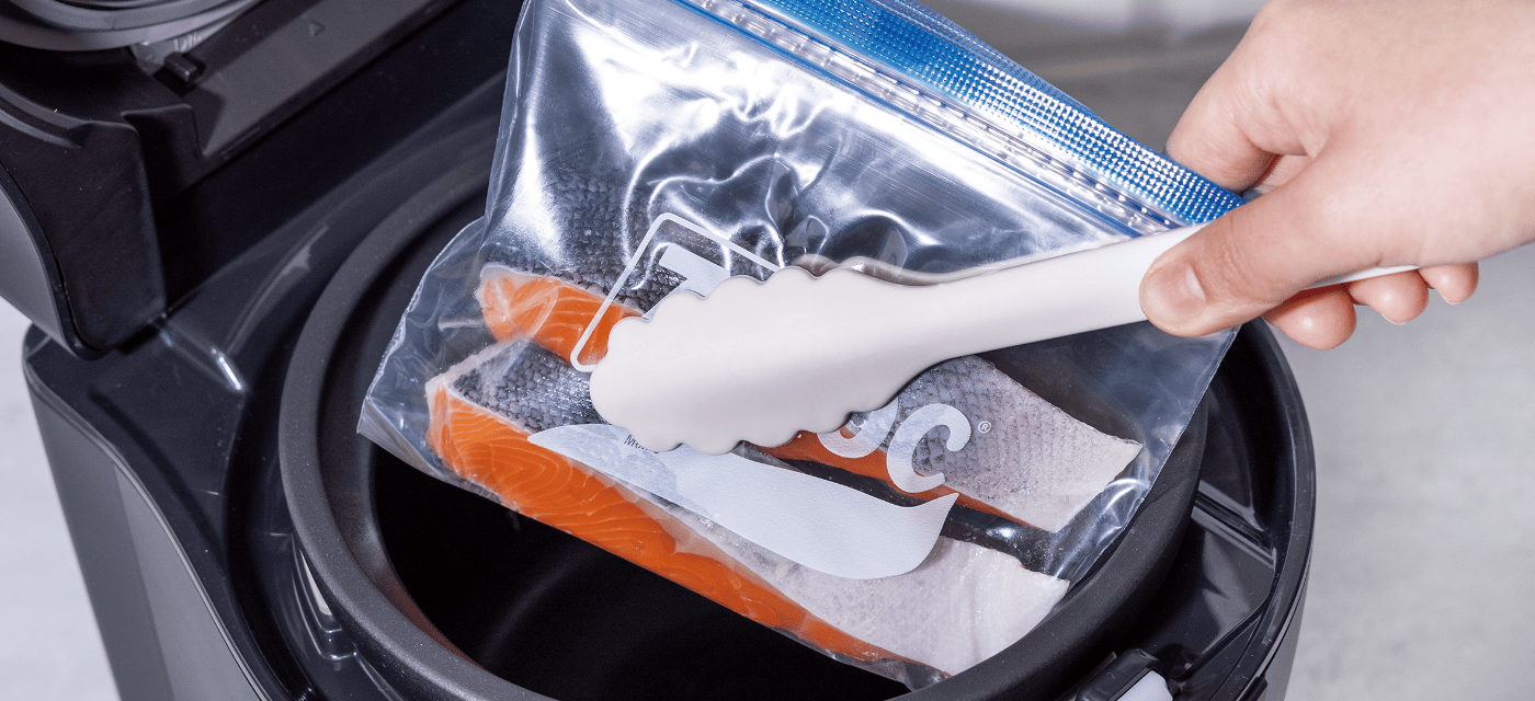 ジッパー付き⾷品保存袋に材料を⼊れて、低温調理⽔位線まで⽔を⼊れる。低温調理ボタンを押して、温度と時間を設定したら、スイッチオン。あとはおまかせ!簡単に、多彩なヘルシーメニューが楽しめます。